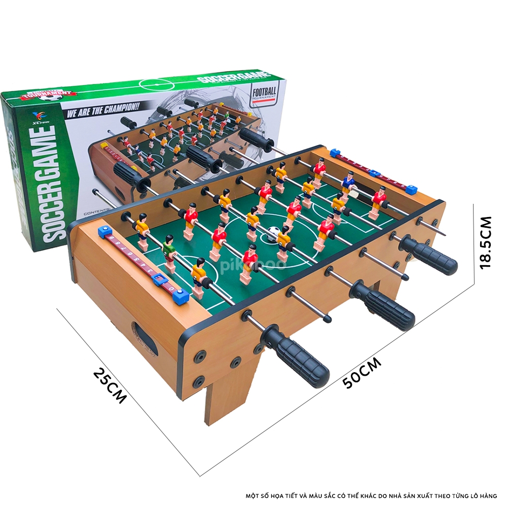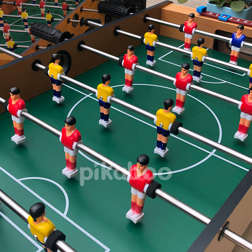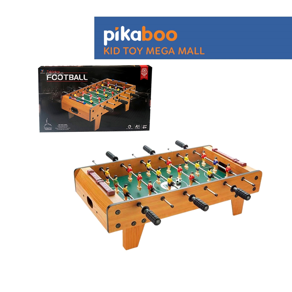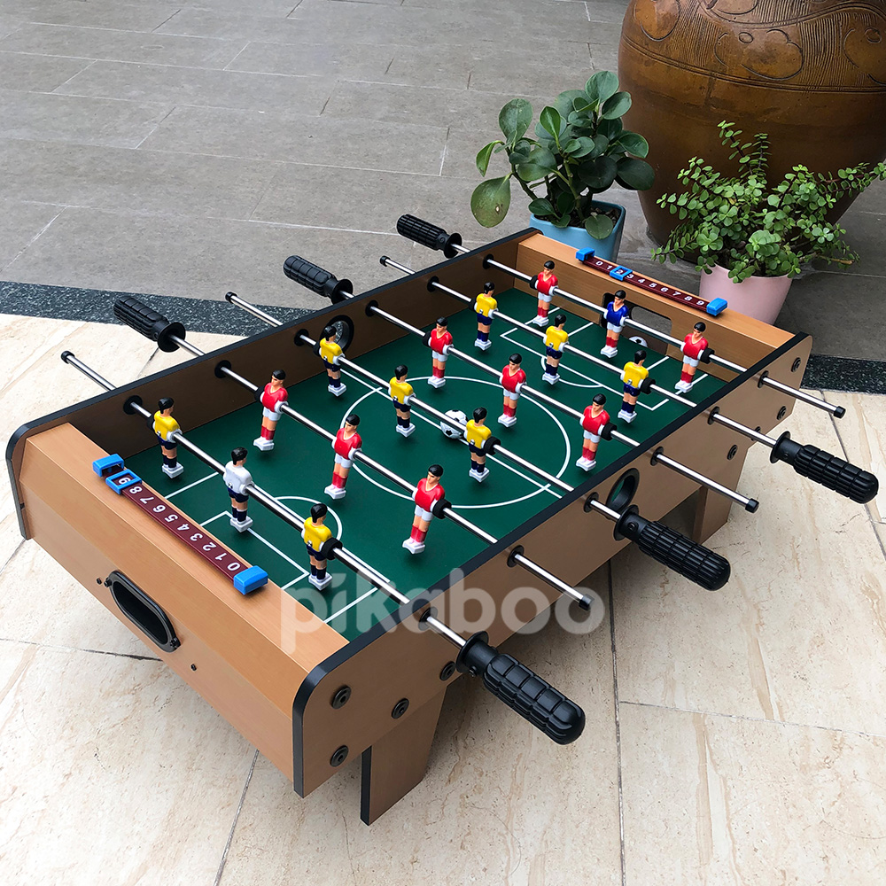 Đồ chơi bàn bi lắc đá bóng Pikaboo mô phỏng thu gọn một trận đấu bóng đá thực tế gồm khung bàn và sân đấu bằng gỗ, mô hình cầu thủ sống động làm từ chất liệu nhựa tổng hợp bền đẹp, các thanh điều khiển kim loại cao cấp, chắc chắn, trơn tru linh hoạt dù chơi ở tốc độ tay quay nhanh hay chậm. Có 2 đội thi đấu mặc quần áo khác màu nhau. Dàn cầu thủ trên sân được bố trí so le giúp bé nhận biết đội mình, đội bạn trong khi chơi. Người chơi sẽ điều khiển tay cầm sao cho cầu thủ đội mình đón được bóng và đá bóng trúng vào khung thành của đội bạn. Tỉ số trận đấu được đánh dấu bởi thanh số ở hai bên cầu gôn của mỗi đội.