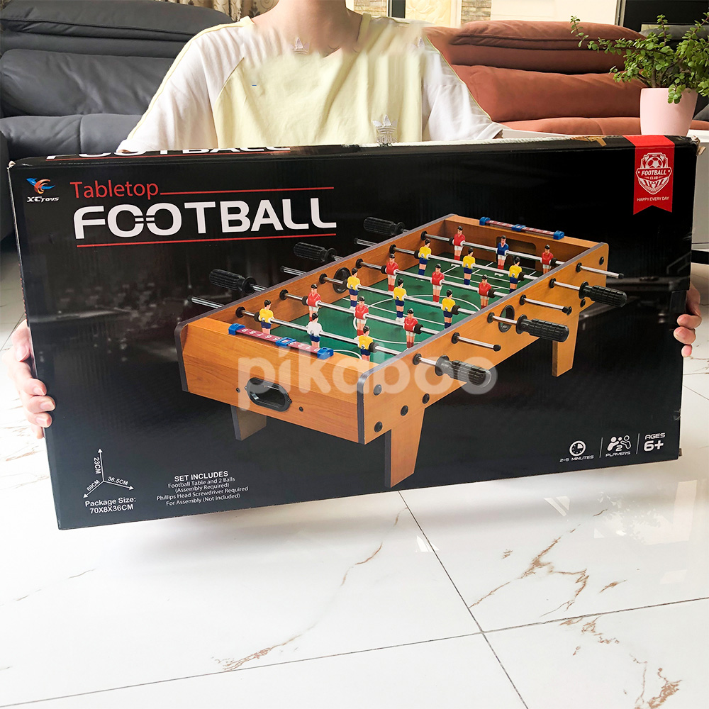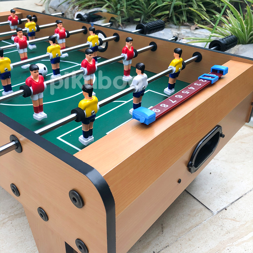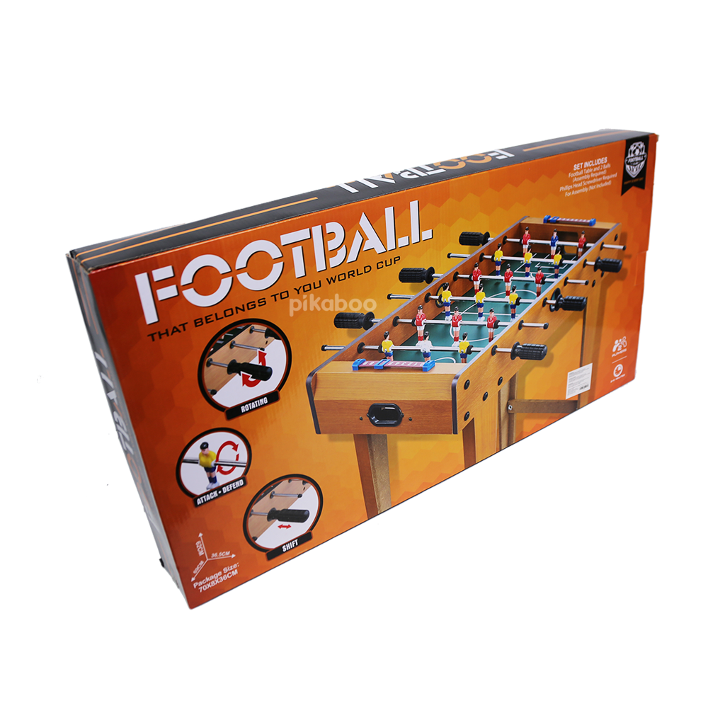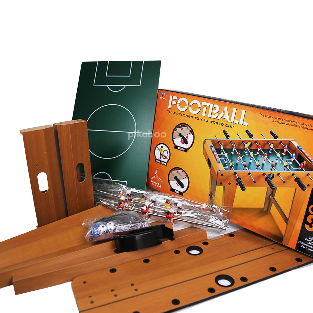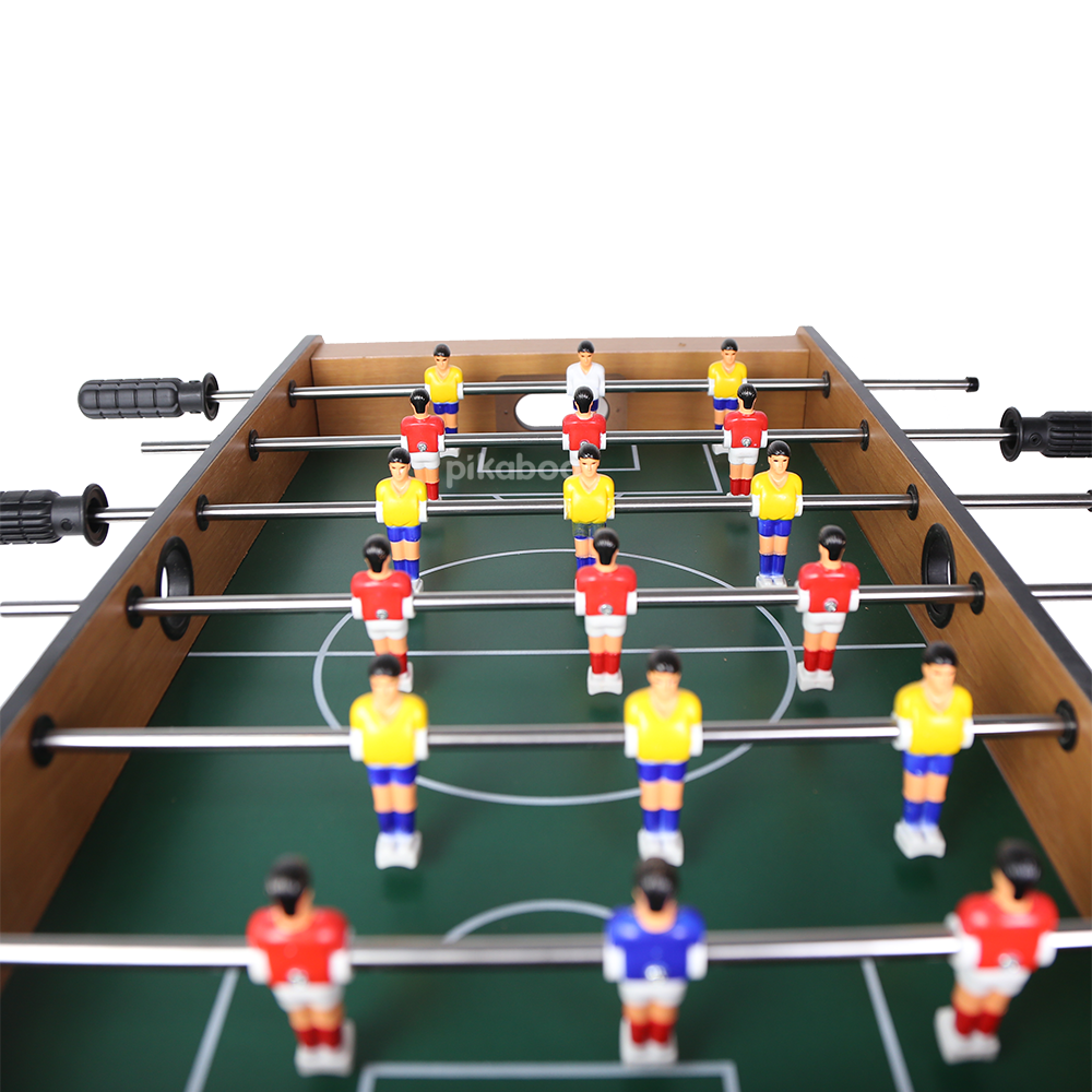 Đồ chơi bàn bi lắc đá bóng Pikaboo mô phỏng thu gọn một trận đấu bóng đá thực tế gồm khung bàn và sân đấu bằng gỗ, mô hình cầu thủ sống động làm từ chất liệu nhựa tổng hợp bền đẹp, các thanh điều khiển kim loại cao cấp, chắc chắn, trơn tru linh hoạt dù chơi ở tốc độ tay quay nhanh hay chậm. Có 2 đội thi đấu mặc quần áo khác màu nhau. Dàn cầu thủ trên sân được bố trí so le giúp bé nhận biết đội mình, đội bạn trong khi chơi. Người chơi sẽ điều khiển tay cầm sao cho cầu thủ đội mình đón được bóng và đá bóng trúng vào khung thành của đội bạn. Tỉ số trận đấu được đánh dấu bởi thanh số ở hai bên cầu gôn của mỗi đội.