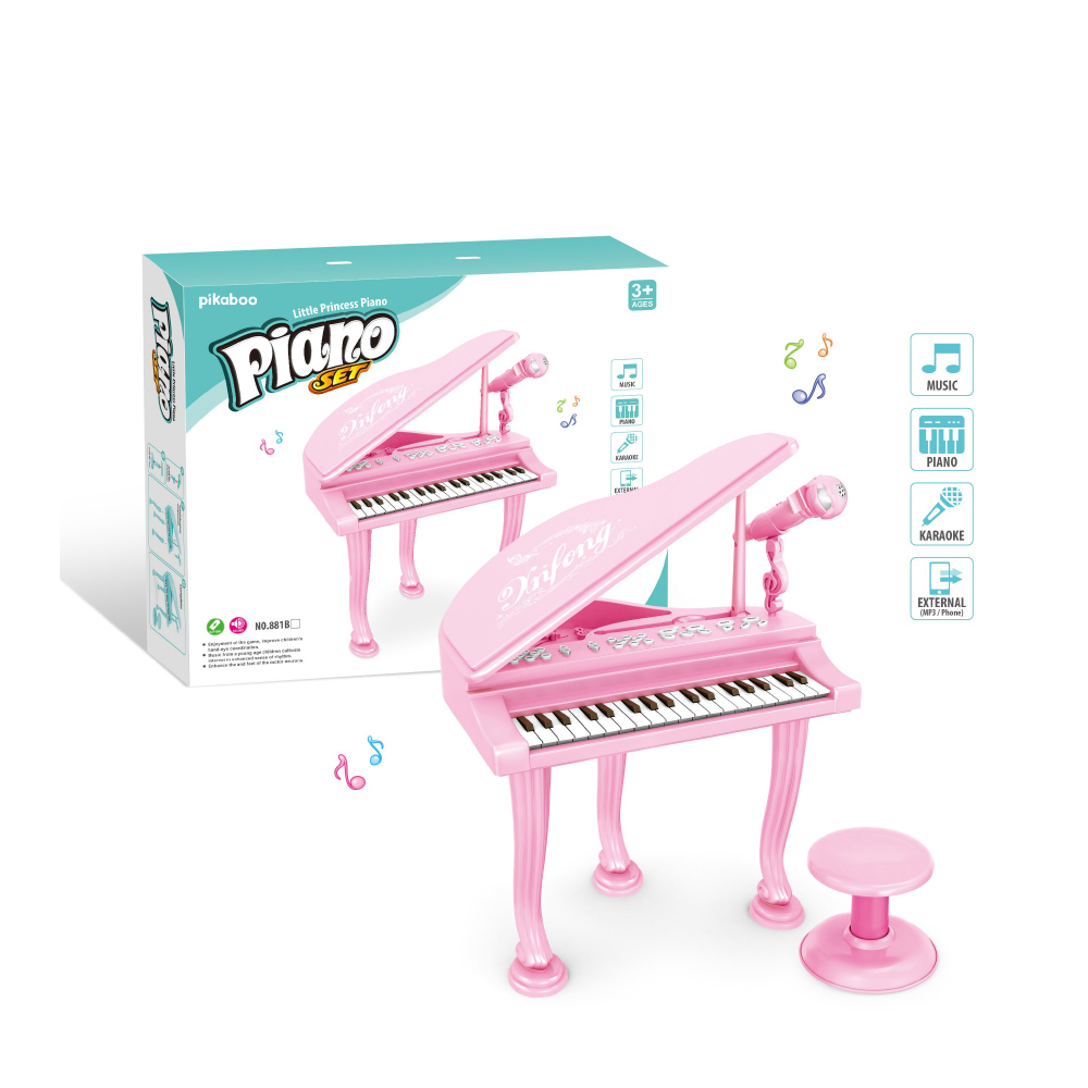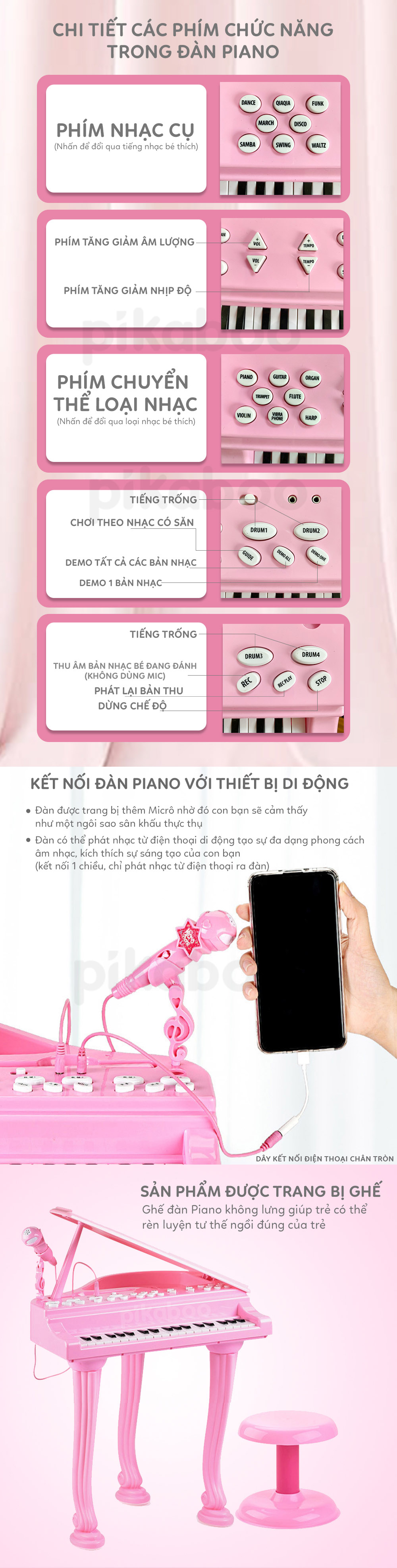 Đàn Piano cho bé gái màu hồng cỡ to đại, có ghế ngồi, kèm thêm micro chuẩn âm thanh. Mô hình như đàn Piano thật, cao cấp, là món quà sang trọng cho bé.
