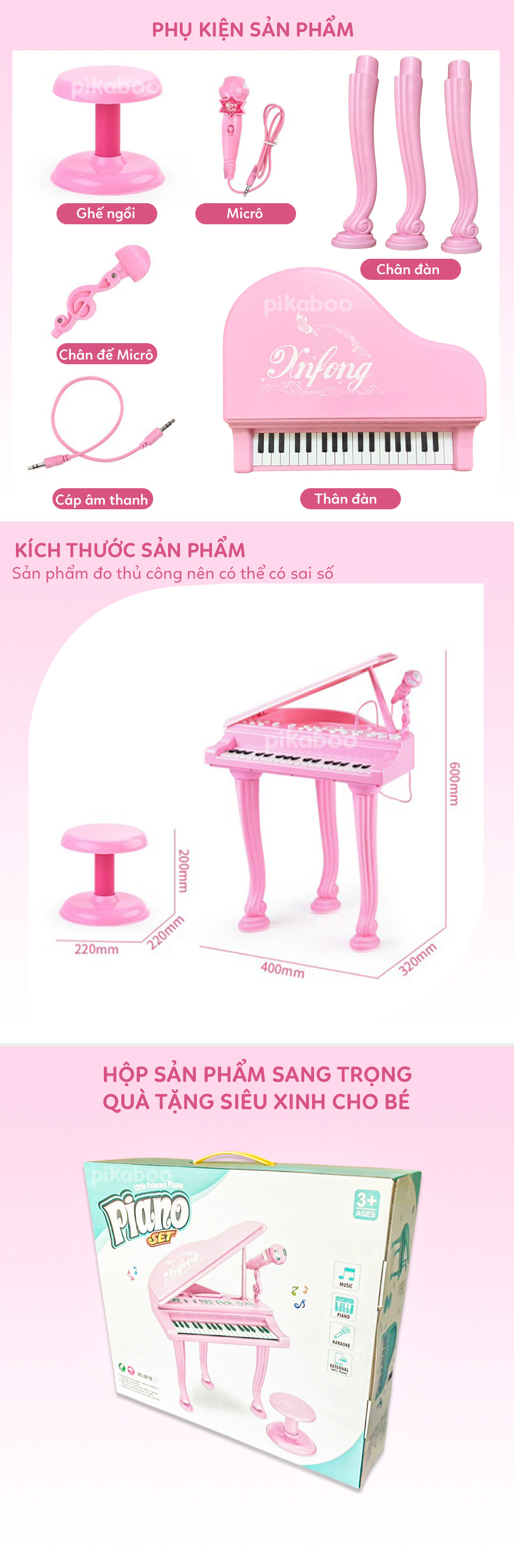 - Gồm: Đàn piano 37 phím âm thanh tiêu chuẩn, sắc nét cho bé cảm thụ âm nhạc tốt hơn, ghế ngồi, micro, cáp nối mp3