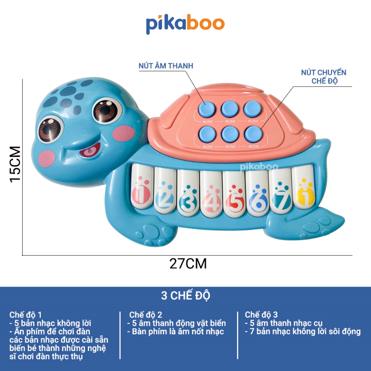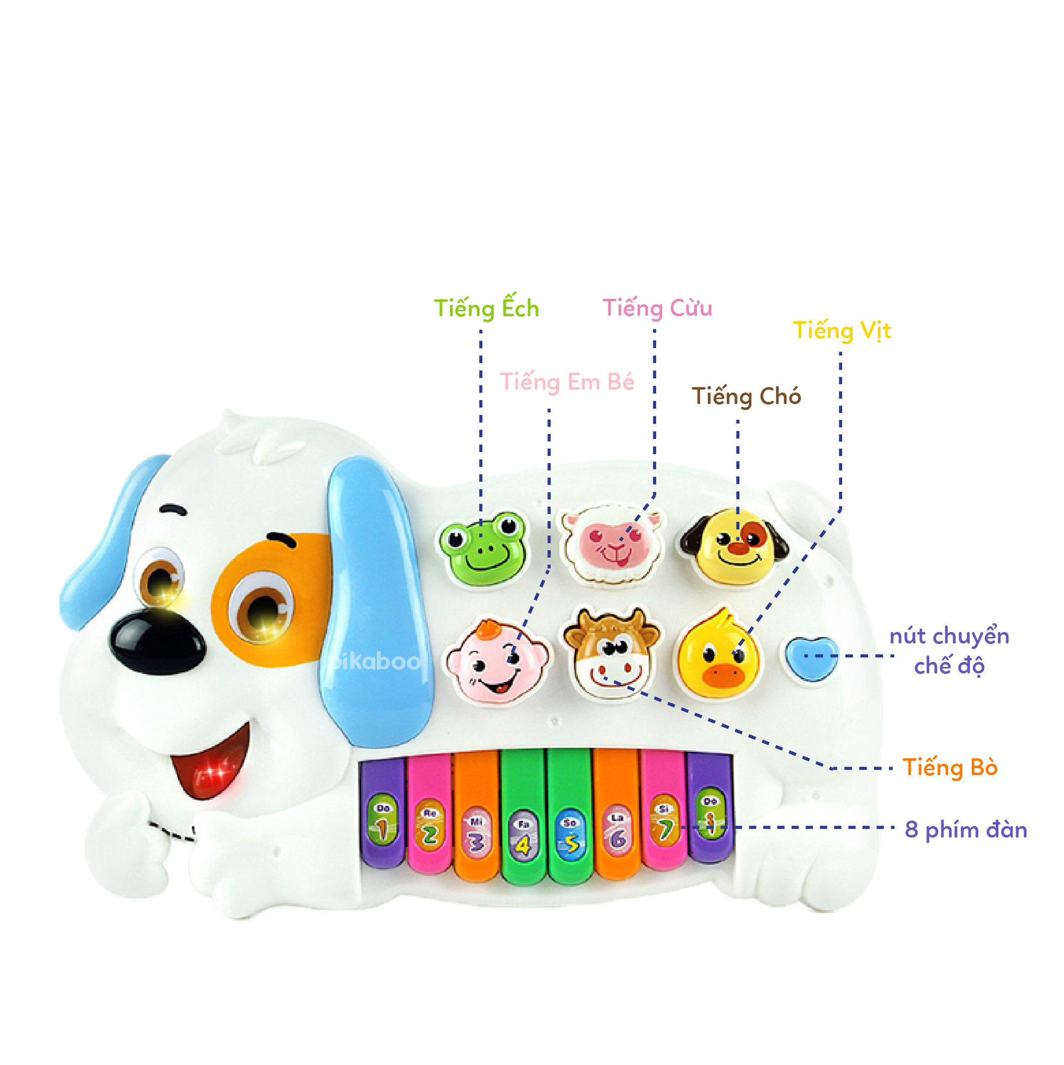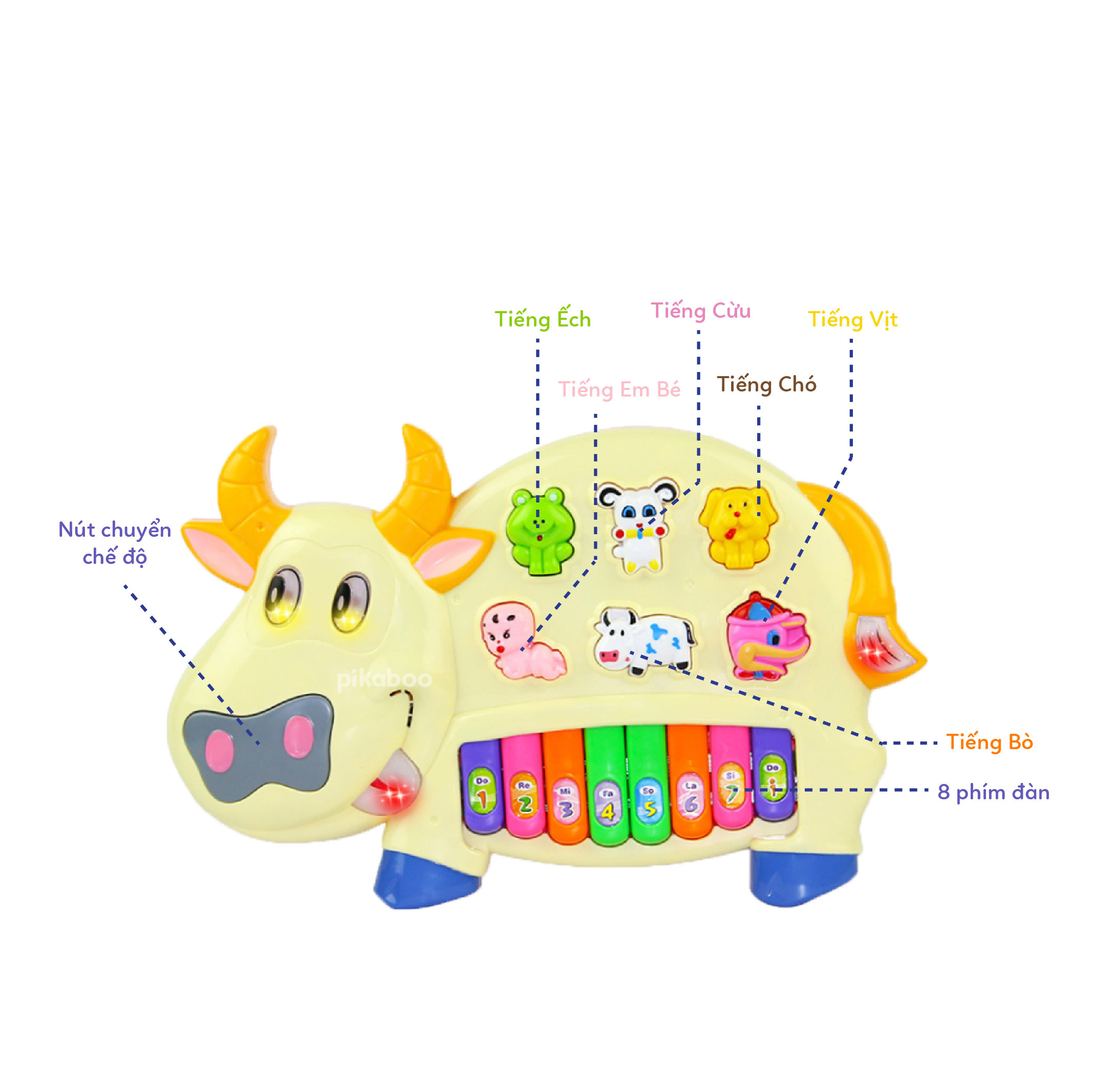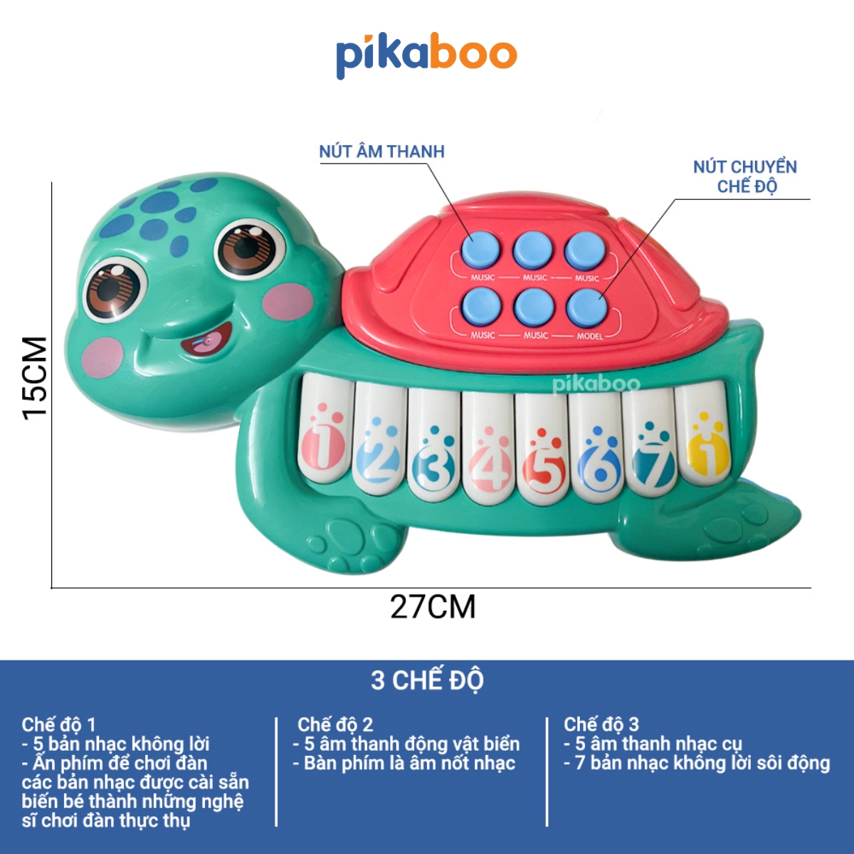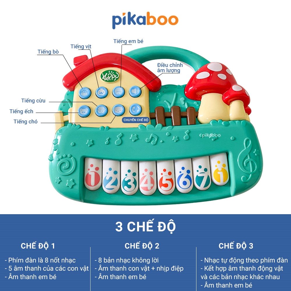 - 2 chế độ phát âm thanh, chế độ 1 là âm thanh của các nốt: đồ, rê, mi, fa, sol, la, si, đô, chế độ 2 là các bài nhạc khác nhau