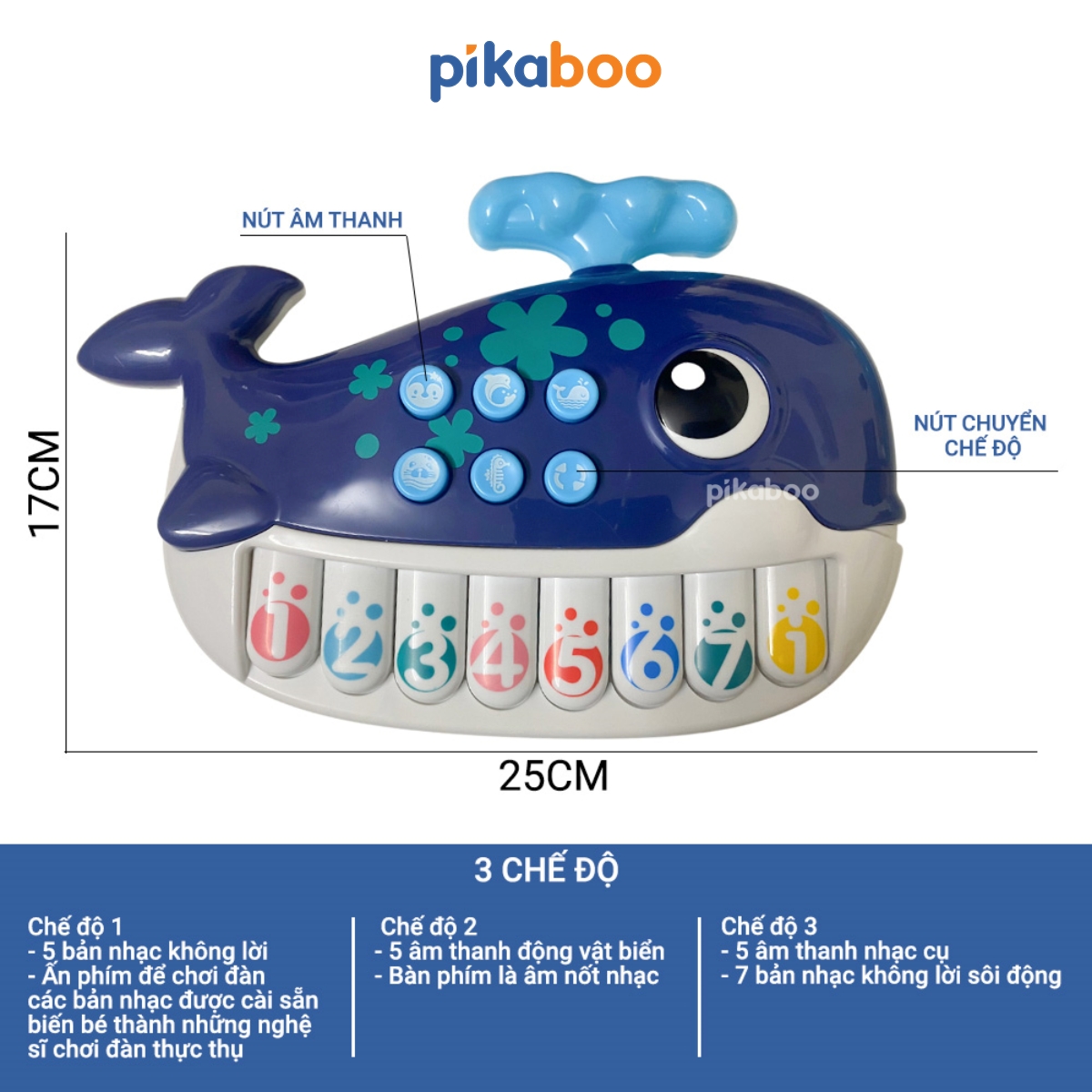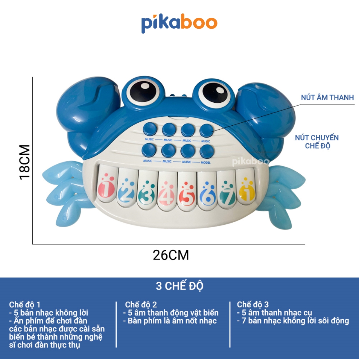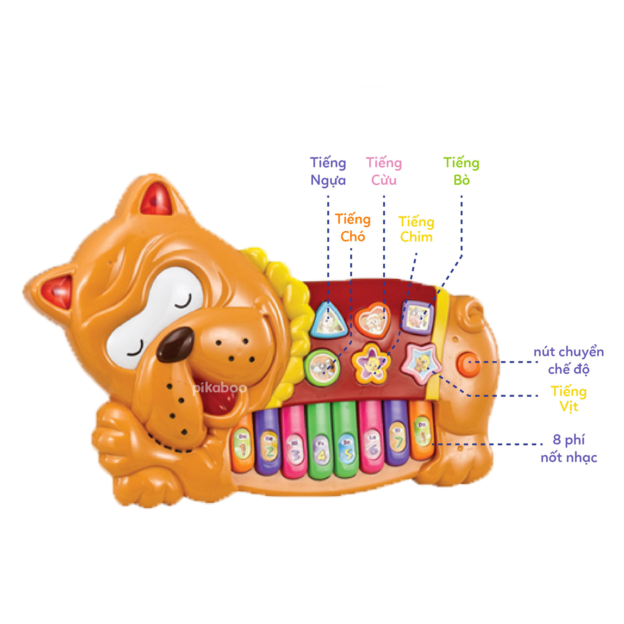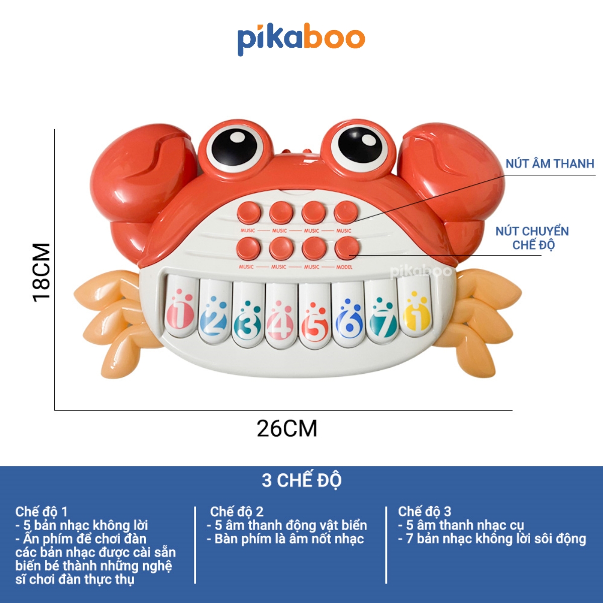 - 2 chế độ phát âm thanh, chế độ 1 là âm thanh của các nốt: đồ, rê, mi, fa, sol, la, si, đô, chế độ 2 là các bài nhạc khác nhau