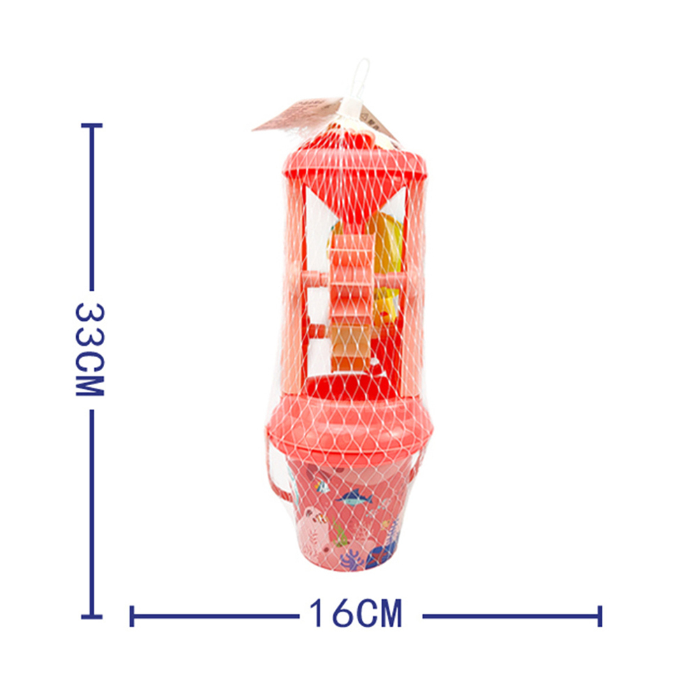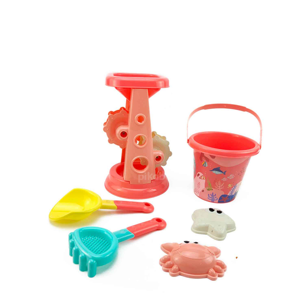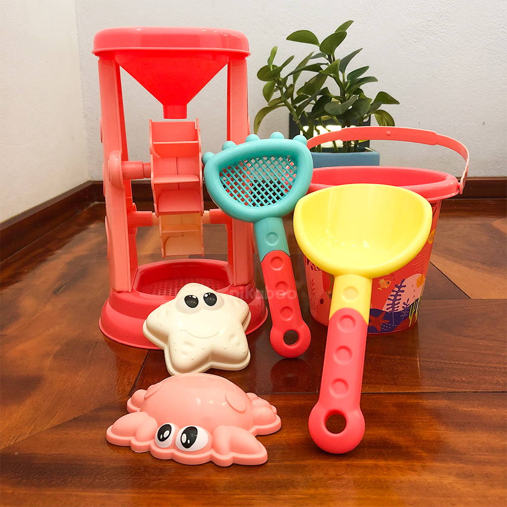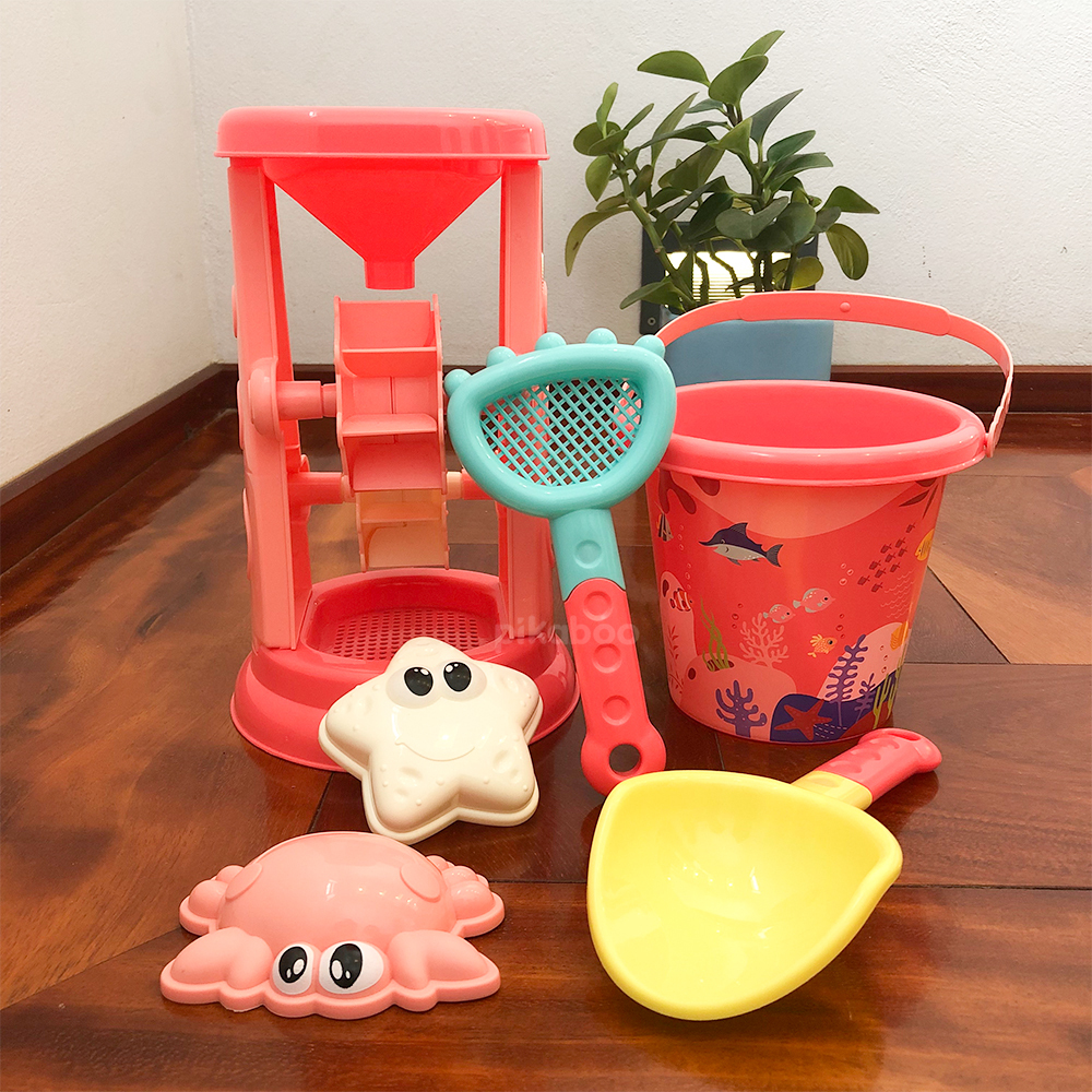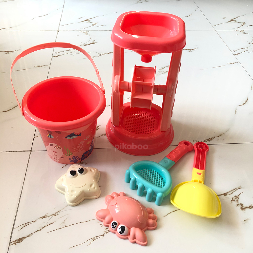 Bộ đồ chơi gồm 6 món là guồng cát, xẻng xúc cát, cào cát, xô đựng, khuôn tạo hình sao biển, ốc biển/cua.