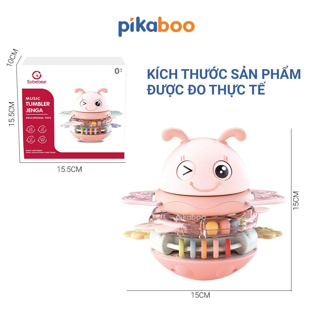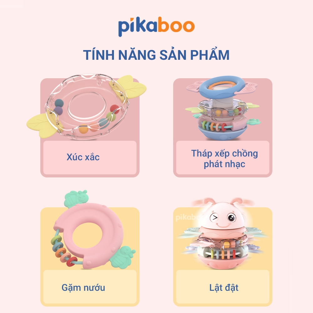 - Đồ chơi là sự kết hợp của 4 tính năng: xúc xắc, xếp chồng phát nhạc, gặm nướu và lật đật