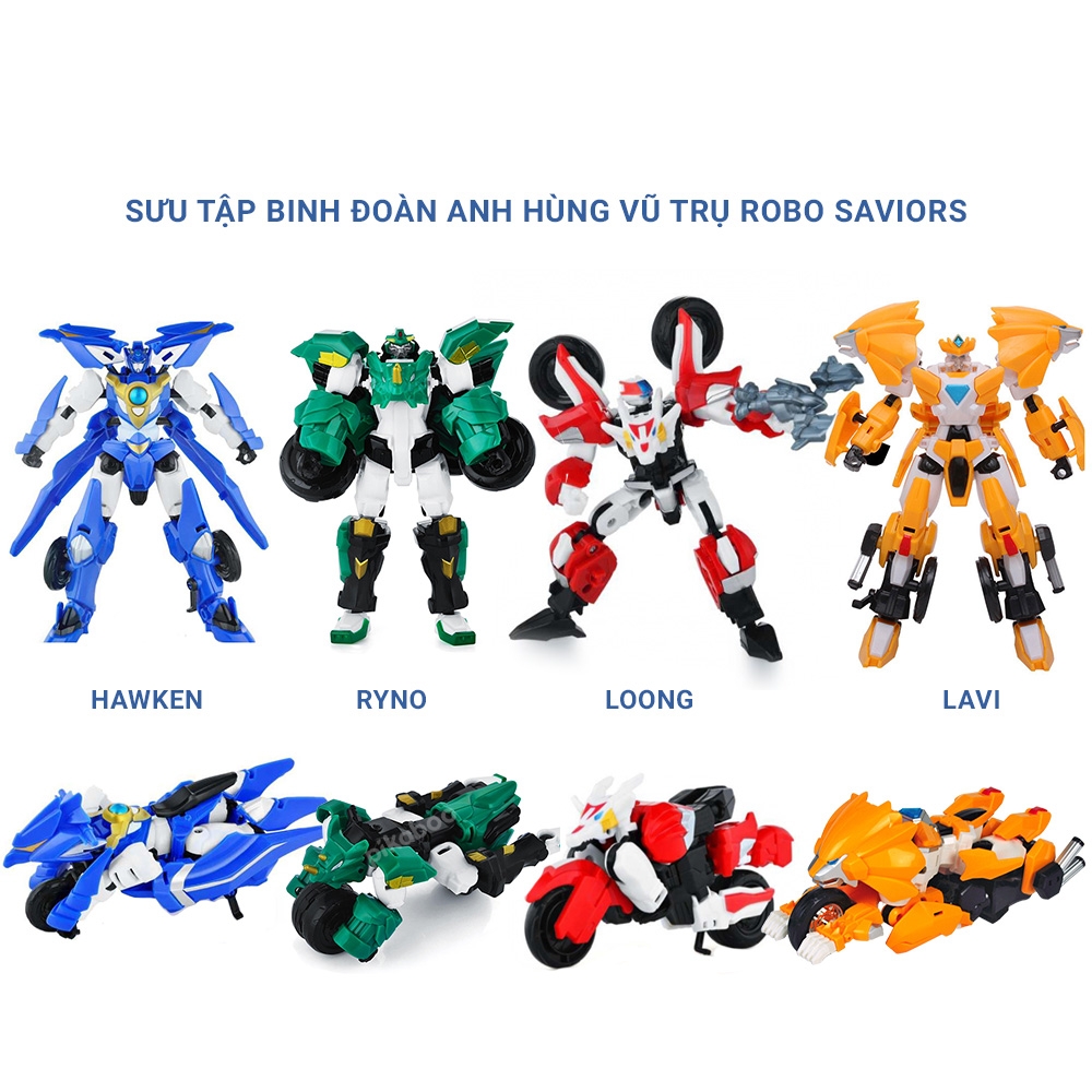 - Bộ sưu tập binh đoàn anh hùng vũ trụ Robo Saviors - bao gồm những vị anh hùng có mối quan hệ như anh em, với chung một mục đích cuối cùng là công lý. Đồ chơi thuộc dòng mô hình lắp ráp với những khớp nối linh hoạt, mang đến khả năng biến hình từ dạng robot sang chiến cơ đẹp mắt, đem đến cho bé những giờ phút khám phá và vui chơi thú vị.