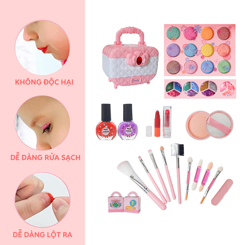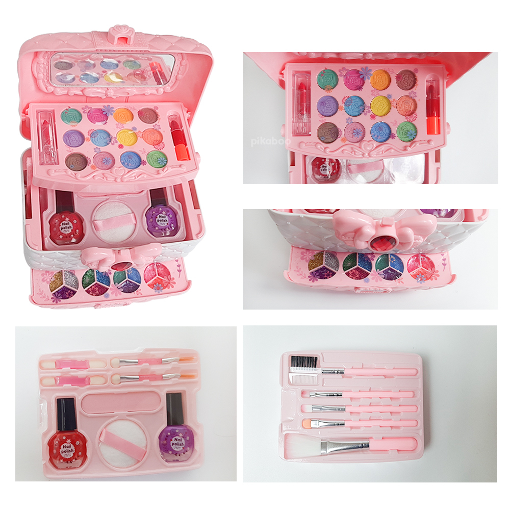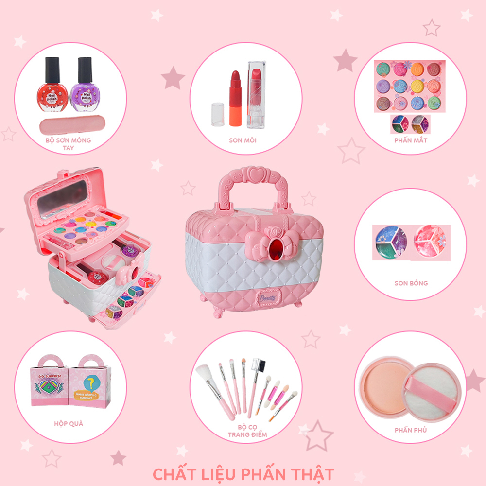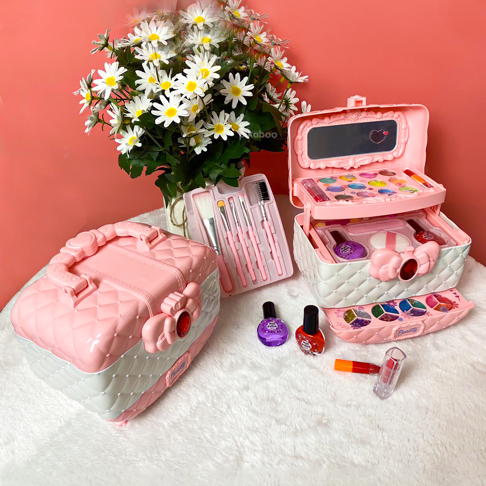 Đồ chơi trang điểm cho bé gái nhiều ngăn và ô đựng, chất liệu cao cấp an toàn cho trẻ nhỏ. Kiểu dáng hộp sang trọng, có nút bấm và nút xoay mở hộp sành điệu. Đủ các đồ dùng dụng cụ như hộp đồ trang điểm cho cô dâu. Son, phấn, nhũ, sơn móng tay, gương, lược, dụng cụ trang điểm.... tất cả đều là sản phẩm thật lại an toàn cho bé yêu.