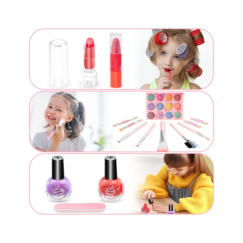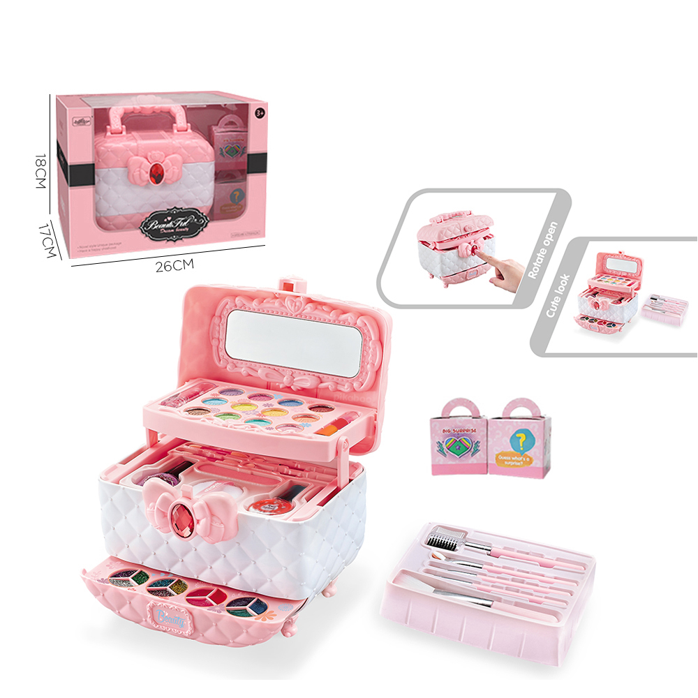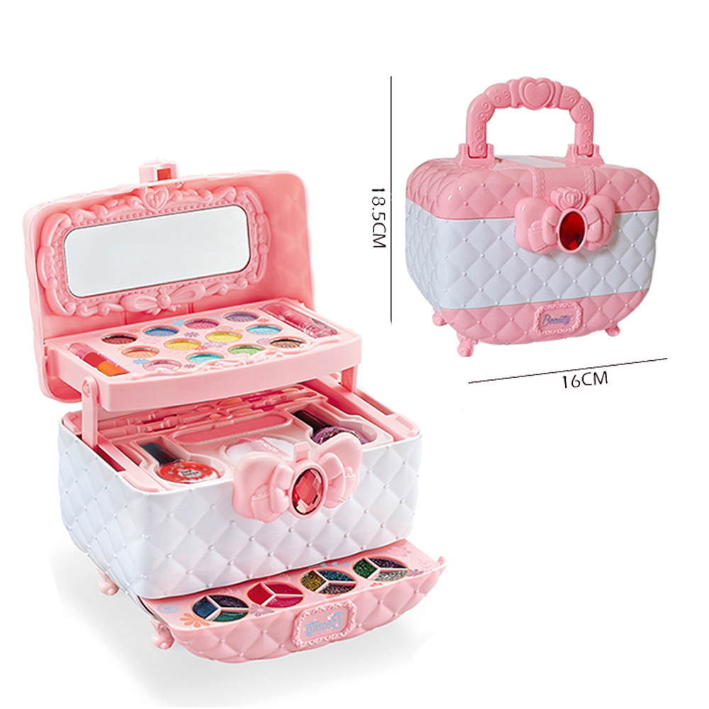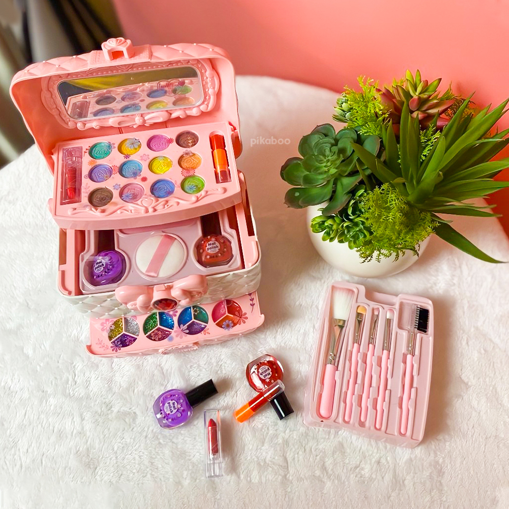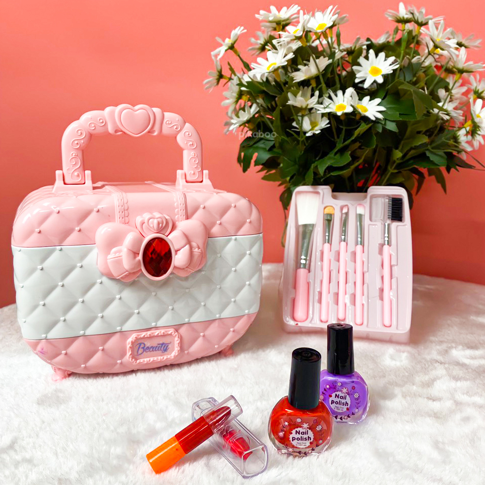 Đồ chơi trang điểm cho bé gái nhiều ngăn và ô đựng, chất liệu cao cấp an toàn cho trẻ nhỏ. Kiểu dáng hộp sang trọng, có nút bấm và nút xoay mở hộp sành điệu. Đủ các đồ dùng dụng cụ như hộp đồ trang điểm cho cô dâu. Son, phấn, nhũ, sơn móng tay, gương, lược, dụng cụ trang điểm.... tất cả đều là sản phẩm thật lại an toàn cho bé yêu.